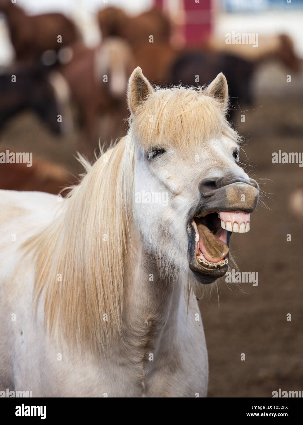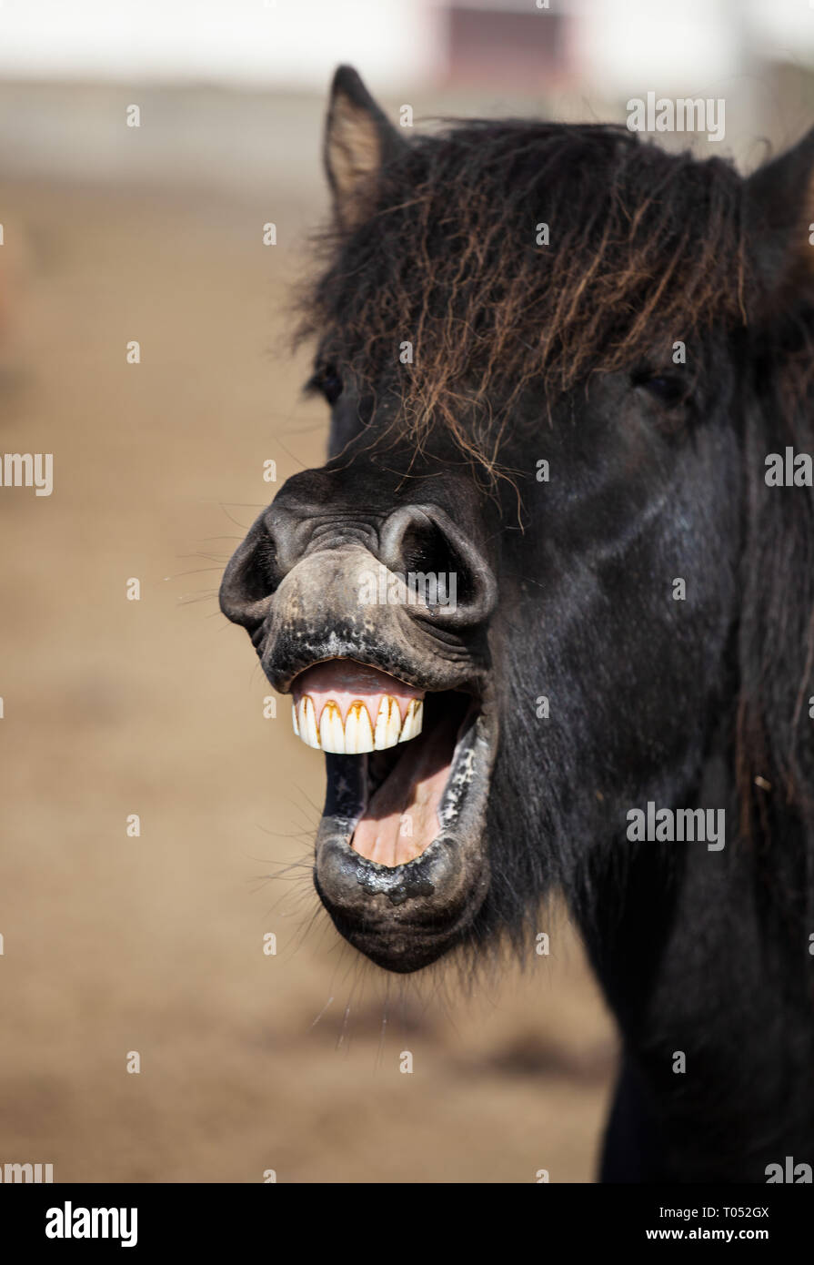 Caballo Islandes Sonriendo Y Riendo Con Dientes Grandes Fotografia De Stock Alamy